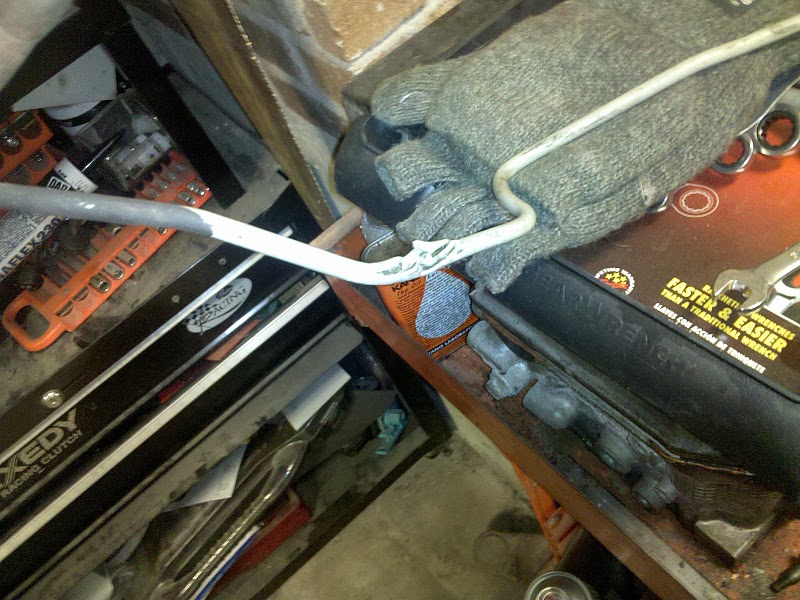 Note to self - "When raising the rear sub frame up - check to make sure things aren't going to be crushed due to lack of room!" - Last night I fixed up the brake line that broke. I had to drop the rear sub frame and remove the passenger side straps off the gas tank just to replace this hard line. The issue was when I raised the sub frame up 1/4 inch or so, I neglected to see there was a brake line run in a very tight area between the frame and sub frame. I ran a new line (with the help from Doug - he loves coming over and removing/installing sub frames) and put everything back where it was.